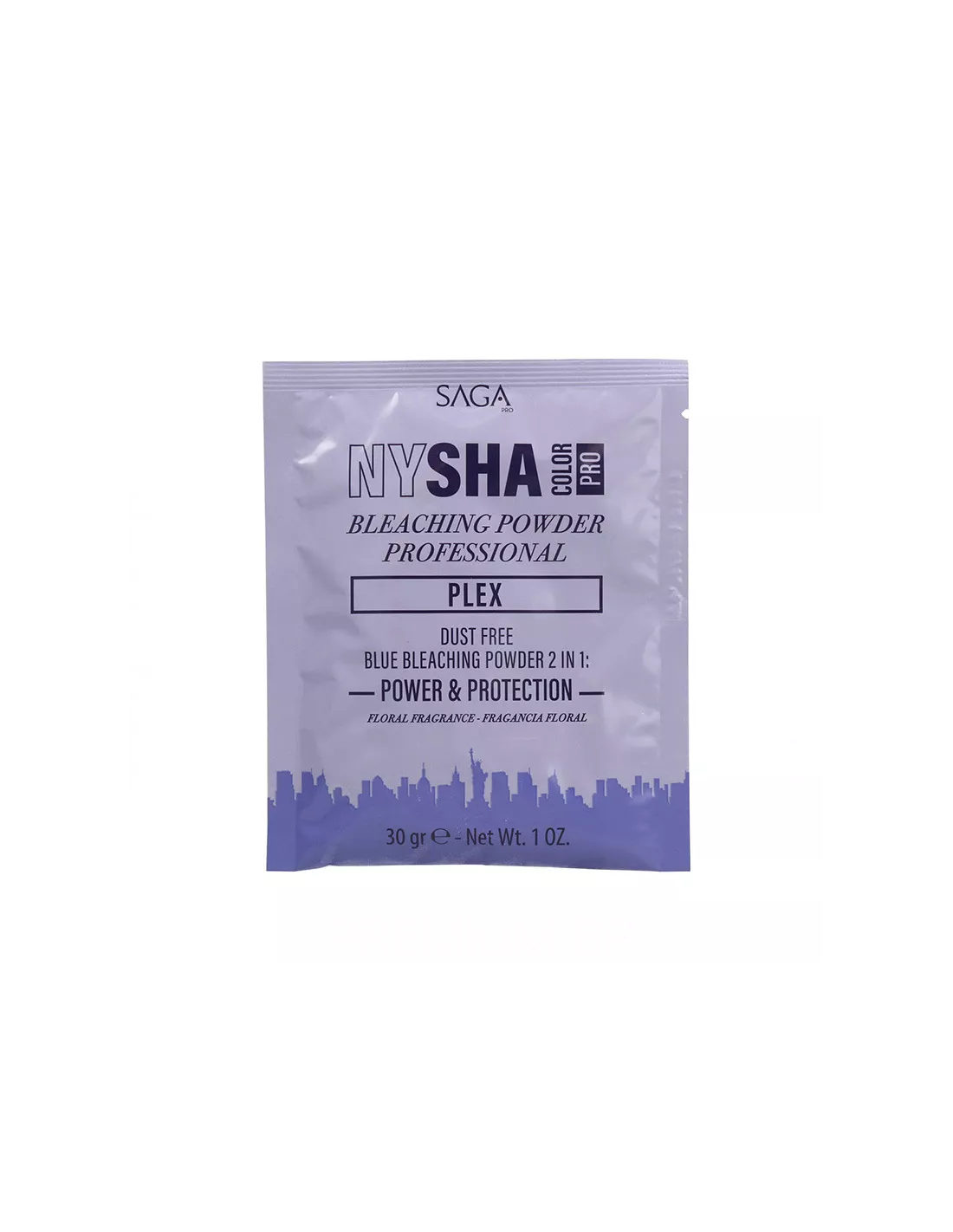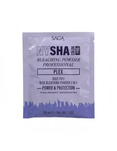 Polvo decolorante azul 2 en 1: fuerza y protección. Con tecnología Plex para ayudar a proteger y preservar la estructura del cabello. Adecuada para todas las técnicas de decoloración. Aclara hasta 7 tonos. MODO DE EMPLEO: Mezclar el contenido del sobre en un bol no metálico con 60 ml de crema oxidante de 20 volumenes para aclarar 3/4 tonos, crema oxidante de 30 volumenes para aclarar 4/5 tonos o crema oxidante de 40 volumenes para aclarar 6 tonos y más. TIEMPO DE ACTUACIÓN: De 20 a 45 minutos